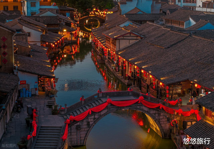 夜幕来临,黄的光泽勾画出古镇的详尽,河水反照着灯光,水光潋滟,沿岸的红灯笼随风轻晃。