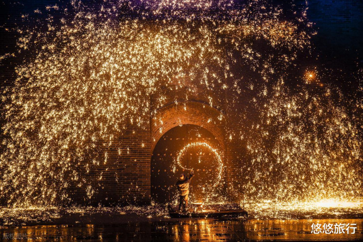 打铁花饰演比烟火震荡,铁水泼洒到古城墙上,一刹溅动怒花。