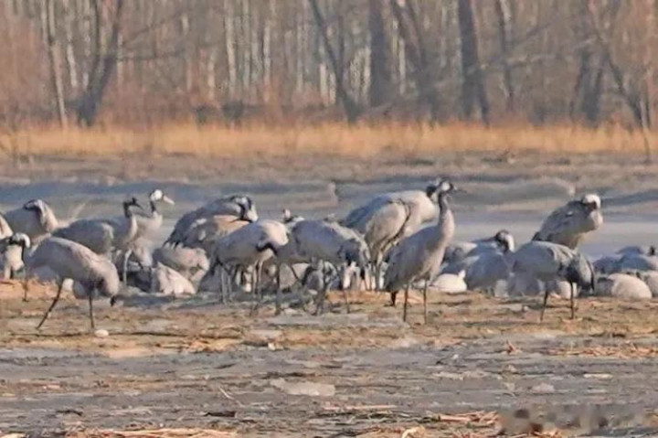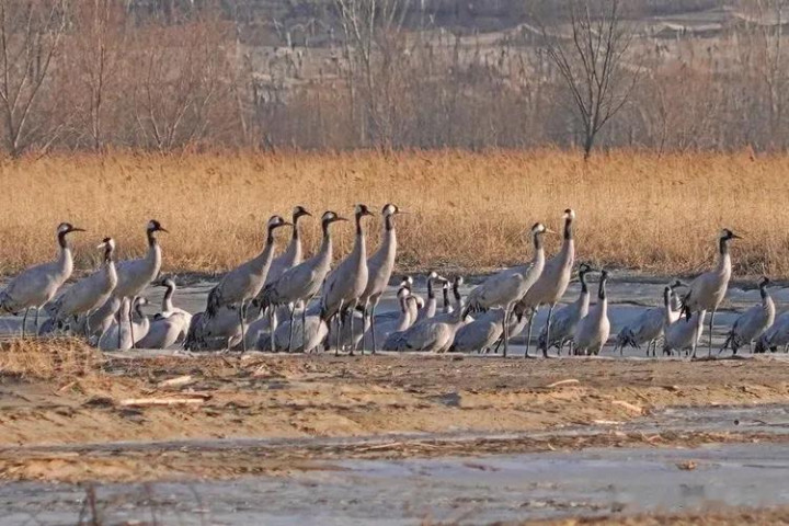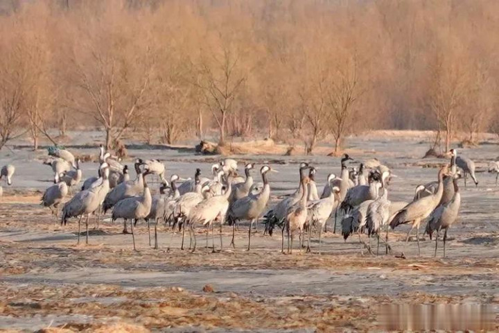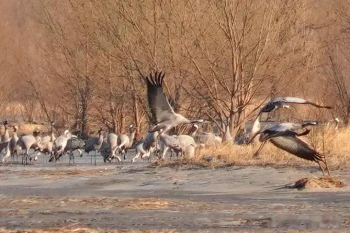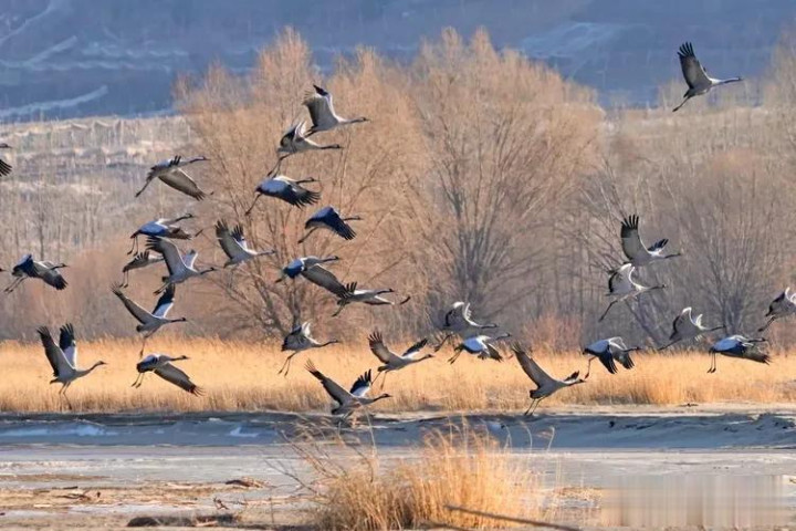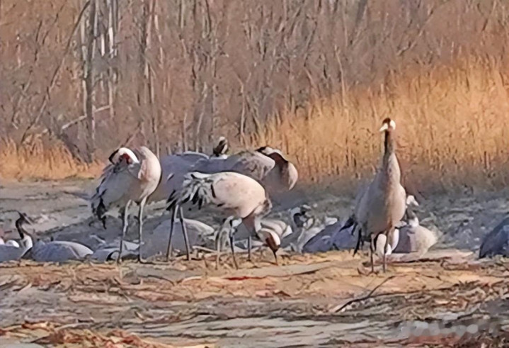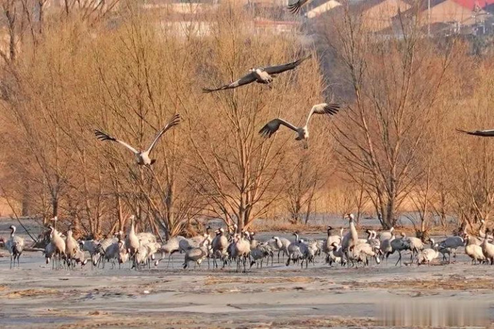 午后的风掠过西湿地的枯苇荡,带着一点清冽的寒意,却吹不散天空边那片流动的青灰色云絮——那是上千只灰鹤,正盘旋在暖金色的斜阳里,翅膀扇动的声响,像是为这片冬日湿地奏响的乐章。