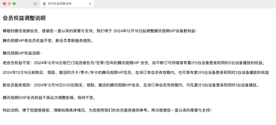同期,老会员权利不变,2024年12月16日前已订阅团结包月/包季/包年的腾讯视频VIP 会员,如不停订可执续享有累计5台建立登录和同期2台建立播放的权利。