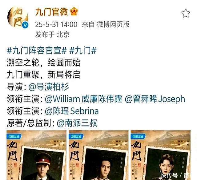 佳节之际,佳音频传。5月31日端午节,多部剧集遴荐在这一天发布官方音问。除了白鹿与丞磊调解的《莫离》以外,备受瞩预备《九门》也细致文书了演员气势开yun体育网,该剧由陈伟霆、曾舜晞以及陈瑶领衔主演。