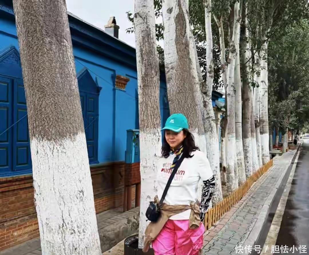 望望这张张王茜华在蓝色民居旁的相片,她穿白T恤,配粉色裤子,走在一行白杨树边,像个在童话里散布的东说念主。