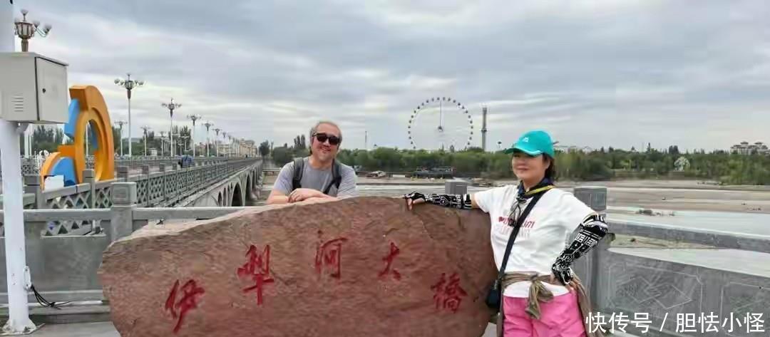 先看他俩在伊犁河大桥的合照,王茜华戴着一个湖蓝色的帽子,下身穿一条粉色裤子,站在刻着“伊犁河大桥”的石头旁,腰板挺得直直的,笑得一脸的灿烂,看起来就像30多岁的风物相称嫩。