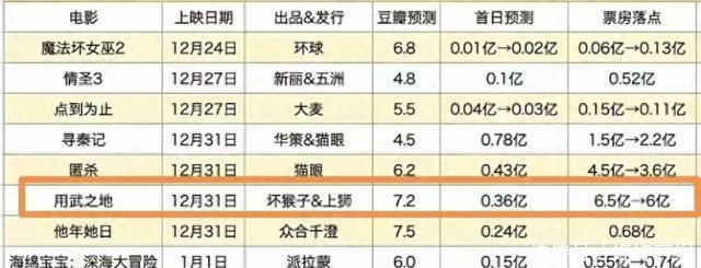临了,咱们来谈谈《用武之地》吧。 影片开了两轮点映,斩获980万票房,现时热度方面仅次于《寻秦记》,现时给出的媒体预测票房要冲击6亿,就算无法结束,4亿到5亿应该是可以结束的。 为啥会说提前锁定跨年档冠军呢?主要如故导演申奥很靠谱。 他当今有两部电影票房都爆到30亿以上了,一部为《作死马医》,2023年暑期档票房冠军,另外一部是《南京影相馆》,亦然本年暑期档票房冠军。