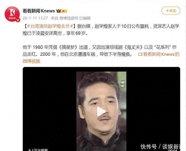 2026年1月10日凌晨,资深演员赵学煌在家东说念主随同下沉稳离世,享年69岁。音讯一出,大量不雅众为之慨叹,不仅为了一位好演员的离去,更为他长达26年与轮椅相伴、却经久刚毅的人命故事。 这位1980年凭《摘星梦》出说念的演员,的确走进两岸不雅众心里,是靠琼瑶剧《鬼丈夫》中阿谁深情的父亲“柯士鹏”。尔后,他成为“儒雅父亲专科户”,在《望夫崖》《茉莉花开》《孽女花》等“花系列”作品中奠定了我方的荧幕地位,成为一代东说念主的缅怀。