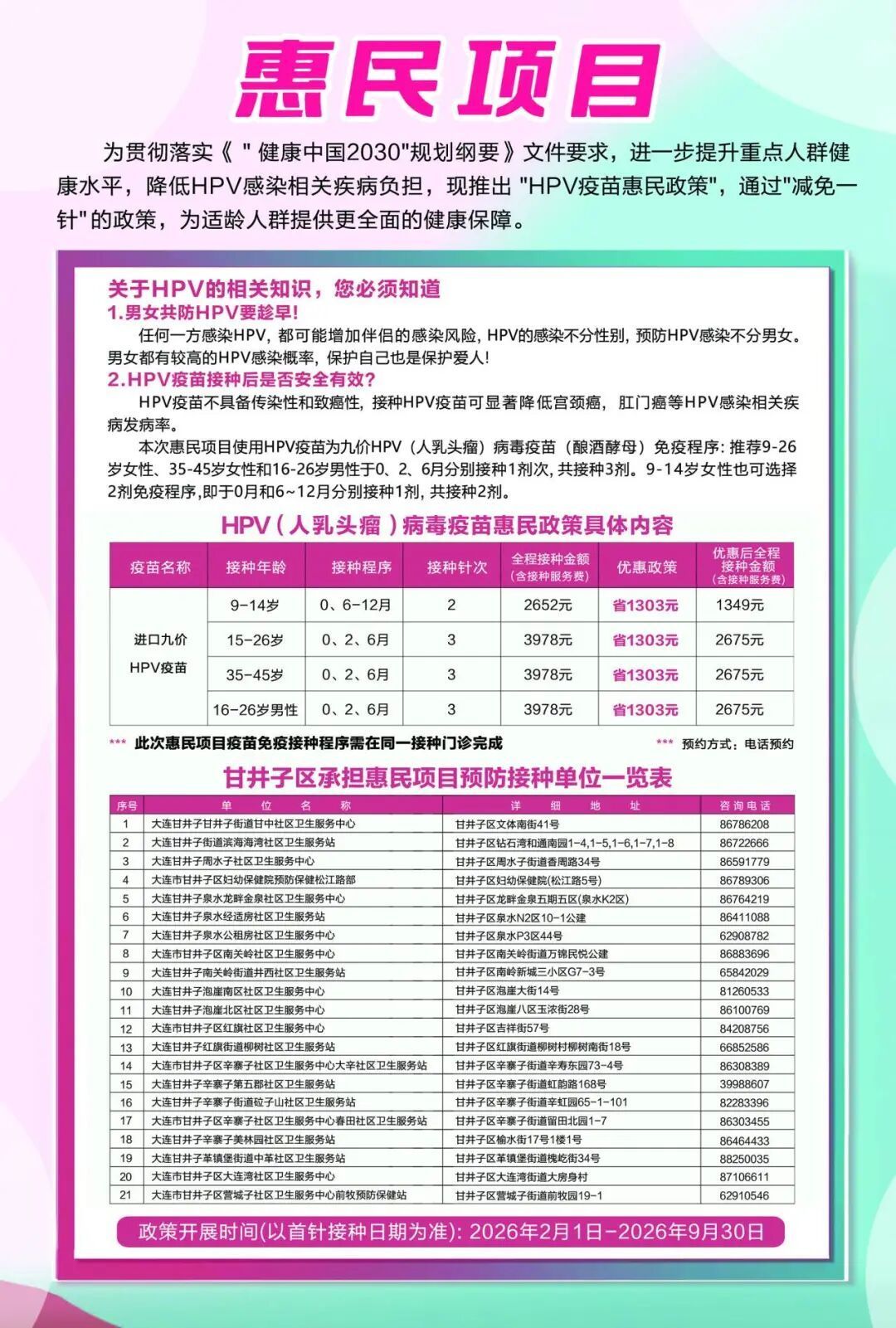 为升迁辖区要点东谈主群健康水平,筑牢全民健康驻守樊篱,大连甘井子区推出2项疫苗接种惠民行径,九价HPV(东谈主乳头瘤病毒)疫苗和重组带状疱疹疫苗接种均践诺“减免一针”策略开yun体育网,免疫接种枢纽需在合并接种门诊完成。辖区21家瞩目接种单元参与实施,为住户提供接种作事,市民可就近预约接种。