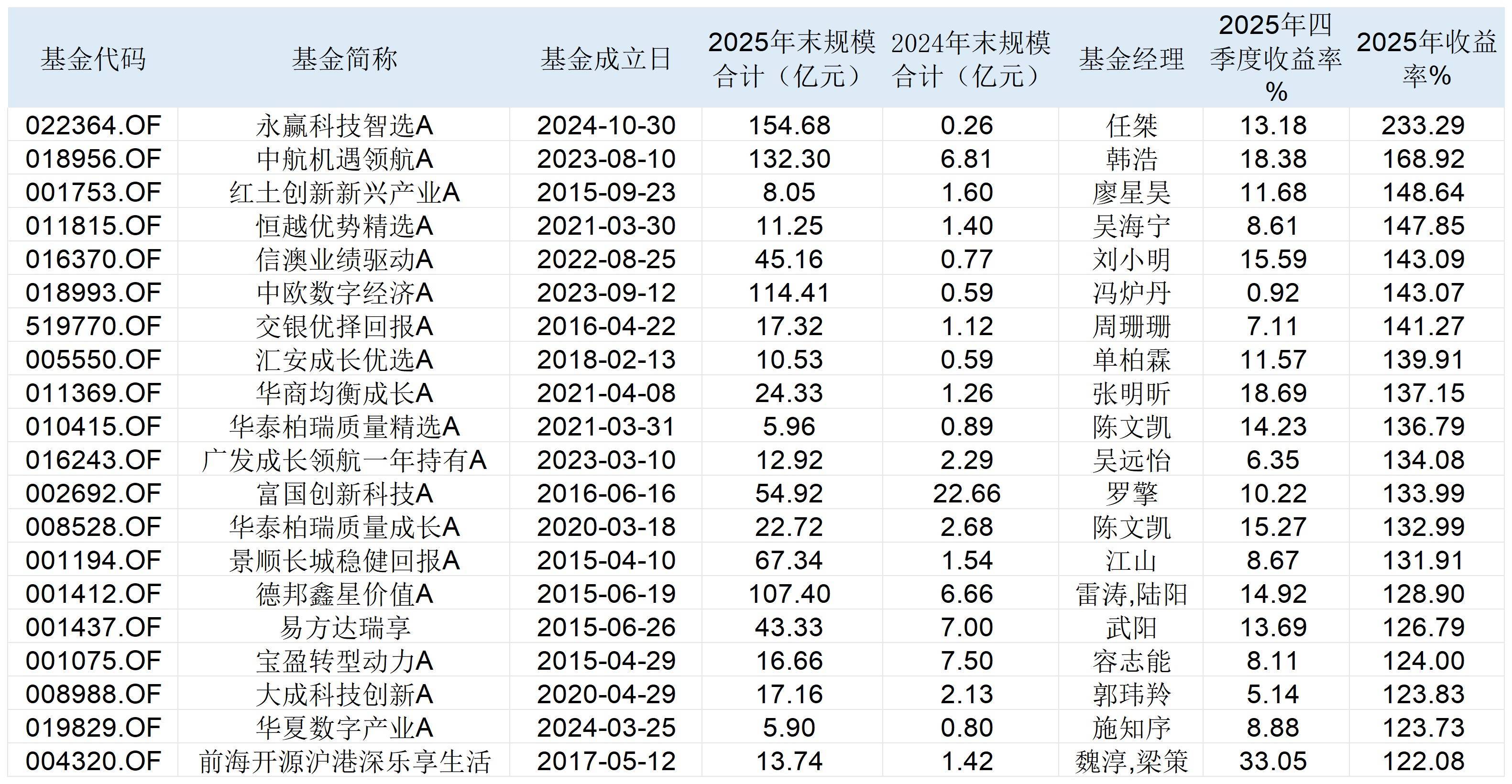 表:2025年收益率名次前20位的主动权柄基金明细开始:Wind 界面新闻整理