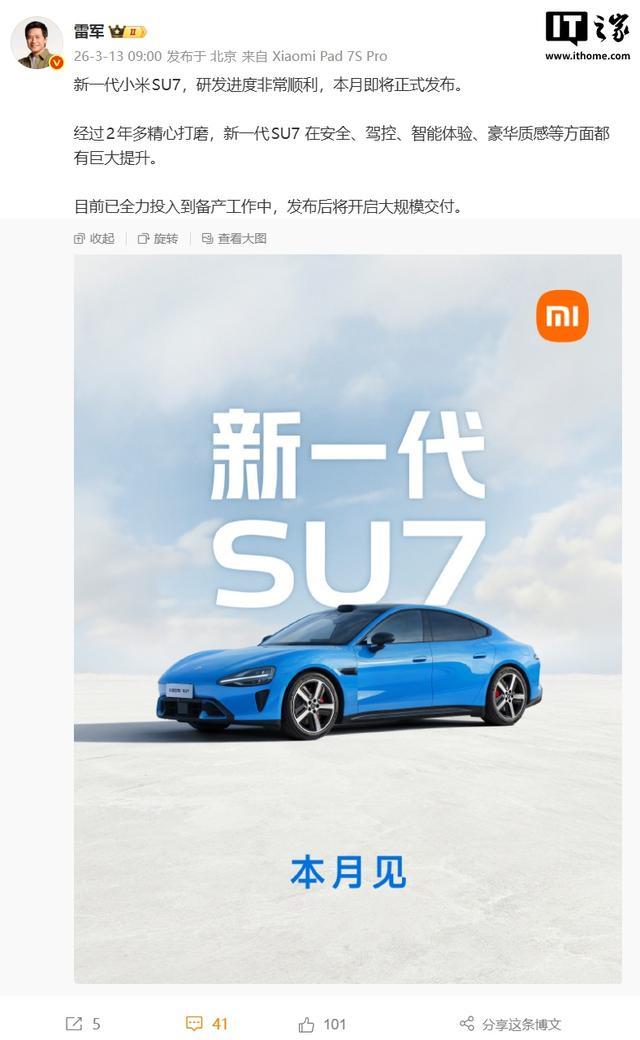 IT之家 3 月 13 日音讯,小米创办东说念主、董事长兼 CEO 雷军当天官宣,新一代小米 SU7,研发进程特地奏凯,本月行将崇拜发布。